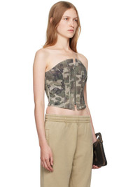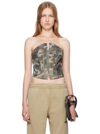 Non-stretch denim corset-style top. Logo and camouflage pattern printed throughout. · Straight neck · Zip closure · Cropped hem · Boning at sides · Shirring at back · Full satin lining · Logo-engraved silver-tone hardware Supplier color: MLC Body: 100% cotton. Lining: 100% polyester. Made in Poland 242937F111007