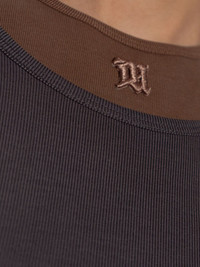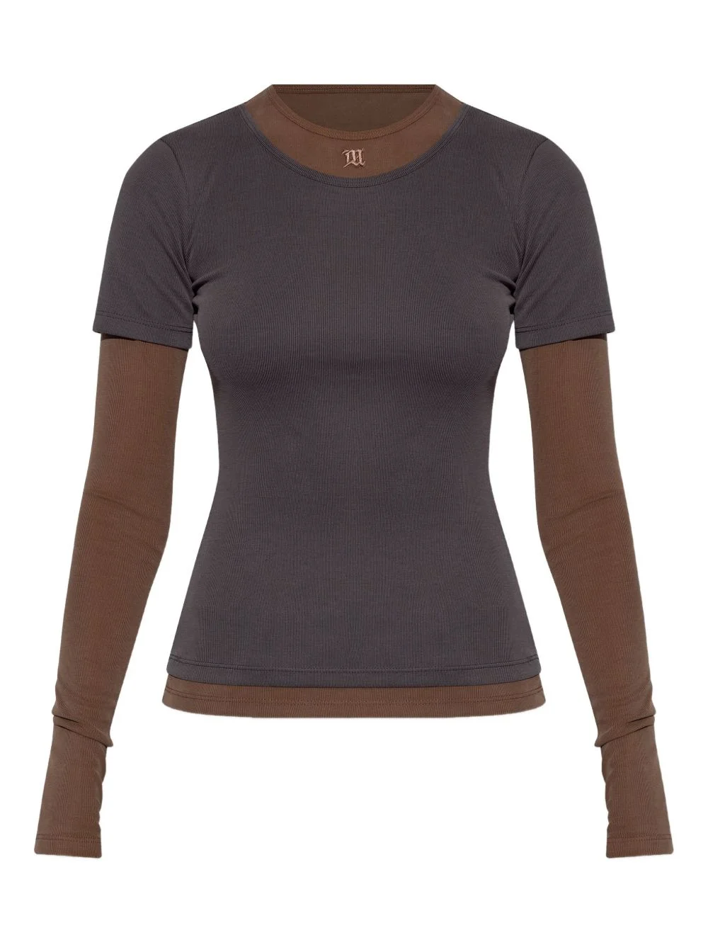 layered long-sleeve top Highlights - Grey - Ribbed knit - Embroidered detail - Round neck - Short sleeves Imported Composition Modal 68%, Polyester 32% Washing instructions Read Manufacturer Guidelines