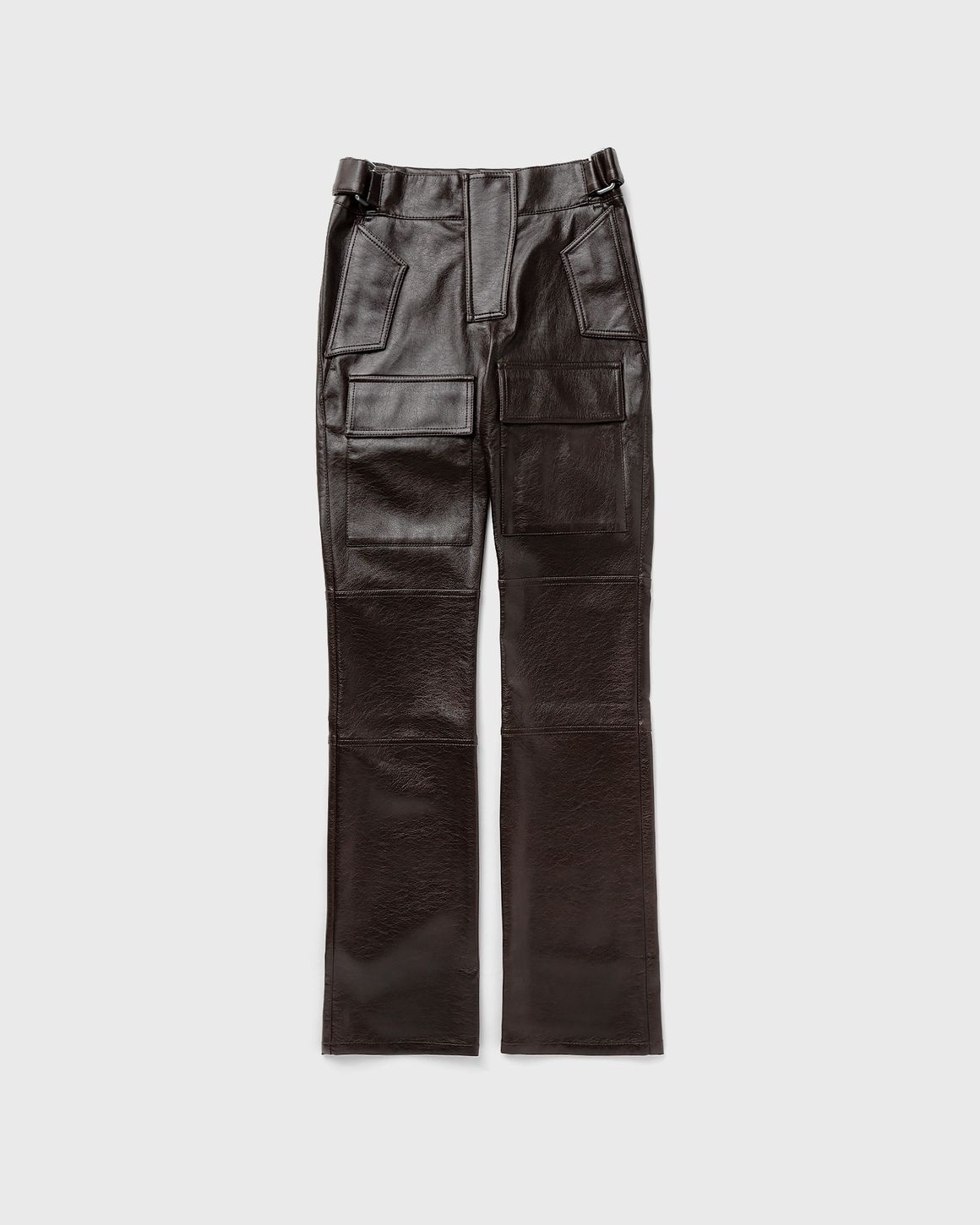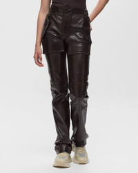 The Faux Leather Moto Trousers by MISBHV are made from brown vegan leather. They feature an adjusted waist and additional leg pockets closed with lapels. - Adjusted waist - Leg pockets - Brushed metal zip and button with logo fastening Article Number: 231W341 Gender: Women Color: BROWN Material: 55% Polyester, 45% Polyurethane