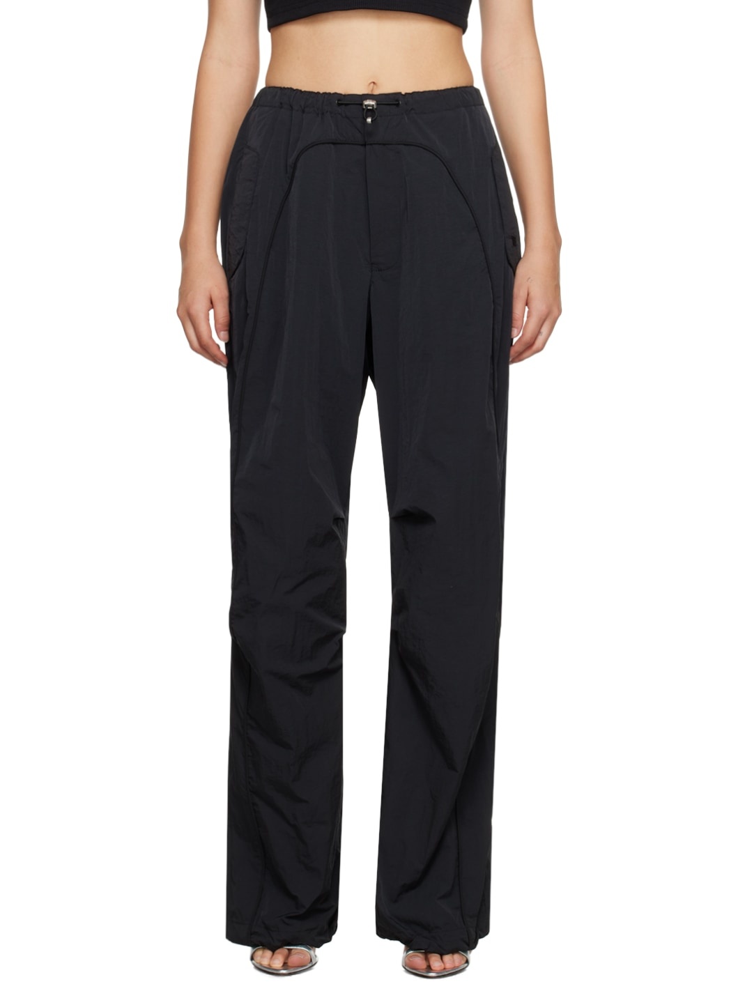Crinkled nylon taffeta trousers. · Bungee-style drawstring at waistband and cuffs · Four-pocket styling · Zip-fly · Piping at front and back · Logo embroidered at front pocket · Logo-engraved silver-tone hardware Supplier color: Black