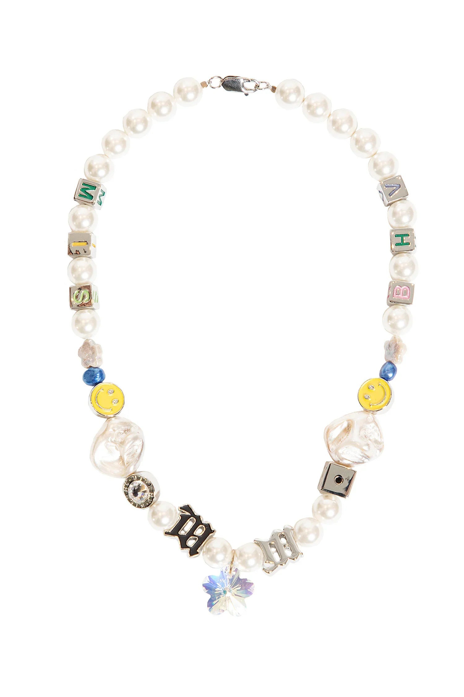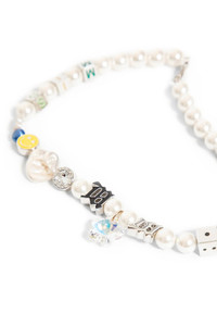 DESCRIPTION - White - Pearl shells, enamelled metal Monogram, enamelled metal smiley and iridescent - Flower-shaped crystal beads - Lobster clasp closure DETAILS - Made in: Poland - Composition: 100% Brass 925 Sterling Silver 100% Resin - Model code: 3121A713 MLC - Item ID: 7596909953202