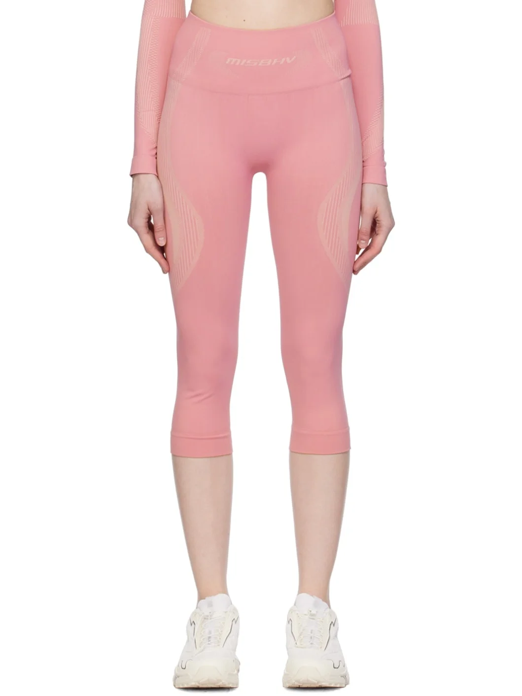 Breathable stretch OEKO-TEX®-certified recycled nylon-blend jersey leggings. Jacquard stripes, check pattern, and overlock stitching throughout. · High-rise · Jacquard logo at elasticized waistband · Rib knit waist and cuffs Part of the MISBHV SPORT collection. Supplier color: Bubblegum 50% recycled polyamide, 40% polyester, 10% elastane. Made in Poland 241937F521000