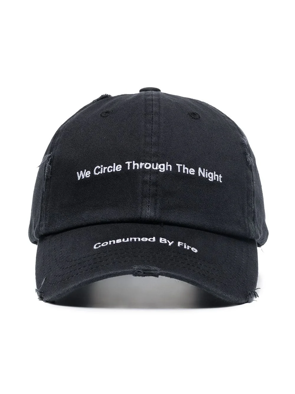embroidered slogan baseball cap This black MISBHV We Circle embroidered cap is crafted from cotton. It features a domed crown, eyelet vents, curved peak and an adjustable strap to the back. It is finished with embroidery which reads, 'We circle through the night consumed by fire.' Well, call us Johnny Cash, because this MISBHV cap is exactly our kind of ring of fire. Imported Composition Cotton 100% SIZE & FIT Model measurements Height 5 ft 9 in(1.76 m) Bust/Chest 33.07 in(84 cm) Hips 38.58 in(98 cm) Waist 24.8 in(63 cm) Measurement BRIM 2.75 in(7 cm) CIRCUMFERENCE 21.65 in(55 cm) Washing instructions Dry Clean Only