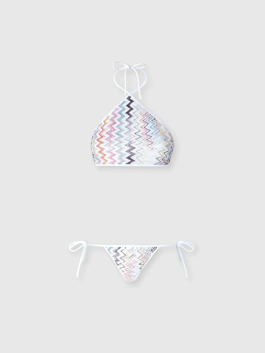 The iconic Missoni zigzag pattern comes to life in this bikini with a halter neckline, enriched by Raschel craftsmanship and sparkling sequins. A piece that celebrates light and movement in every detail. MORE DETAILS - Women's bikini - Halter neckline - Elegant sequins - Iconic zig zag pattern Composition: EXTERNAL:64%Rayon, 36%Polyester; LINING : 80%Polyamide, 20%Elastane Care instructions: Hand wash ; Do not tumble dry ; Do not dry clean ; Do not iron ; Do not bleach Made in: Italy Product ID MS25SP0QBR012VSM9QG