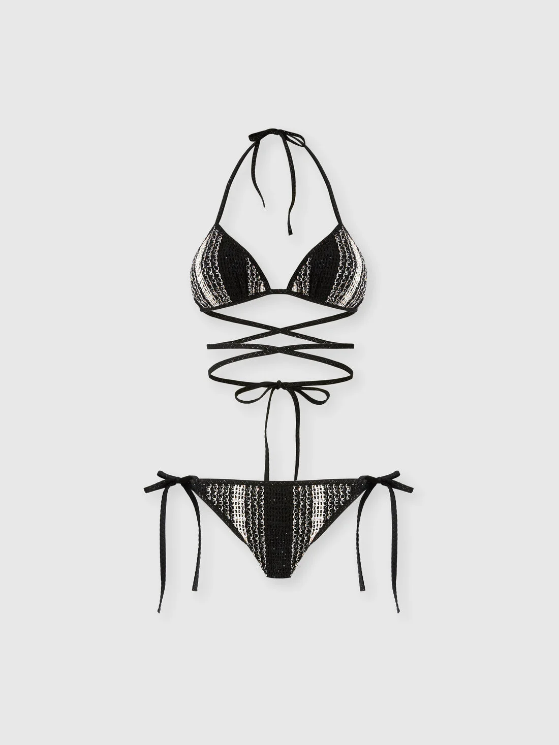 A bold graphic design characterises this women's bikini with long, adjustable ties, made from a cotton blend mesh fabric and embellished with sequin appliques. The construction enhances the fit, creating a bright and distinctive beachwear piece. MORE DETAILS - Women’s bikini with long wraparound ties - Mesh construction - Cotton blend with sequin application Composition: EXTERNAL:48%Cotton, 35%Polyamide, 17%Polyester; LINING : 80%Polyamide, 20%Elastane Care instructions: Hand wash ; Do not tumble dry ; Do not dry clean ; Do not iron ; Do not bleach Made in: Italy Product ID MC26SP06BV00J7S91SR