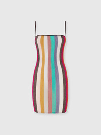 The short sleeveless dress, in lame rib knit, stands out for its fitted design and refined texture. The thin straps and the striped workmanship, embellished with lurex accents, give the garment a contemporary elegance. Ideal for those looking for a refined look, which combines brightness and versatility in a single piece. MORE DETAILS - Short model dress - Ribbed sweater with lame - Striped pattern - Sleeveless Composition: EXTERNAL:79%Rayon, 21%Metal Fiber Care instructions: Ironing maximum temperature 110°C - without steam ; Dry cleaning in tetrachloroethene - mild process ; Do not tumble dry ; Do not wash ; Do not bleach Made in: Italy Product ID MS25SQ19BT0092SM9MU