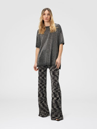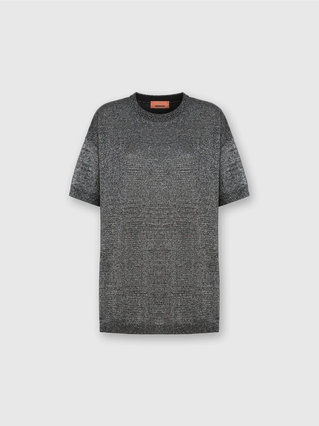 Boxy short-sleeve crew-neck women’s sweater, characterized by refined vanise workmanship that enriches the garment with an elegant texture. Lame threads sprinkle the surface, adding shine and a touch of brilliance, for a sophisticated and modern look that expresses all of Missoni’s mastery in the details. MORE DETAILS - Boxy crew neck short-sleeve sweater - Vanise knit - Viscose blend with lame threads Composition: EXTERNAL:88%Rayon, 12%Metal Fiber Care instructions: Dry cleaning in tetrachloroethene - mild process ; Ironing maximum temperature 110°C - without steam ; Dry flat ; Iron inside out ; Dry inside out ; Do not tumble dry ; Iron with a cloth between ; Do not wash ; Do not bleach Made in: Romania Product ID DS25WN04BK01BYL905D