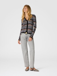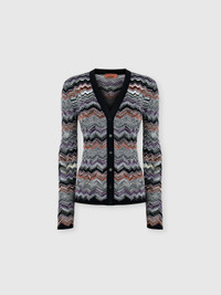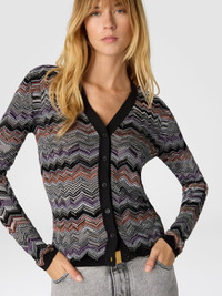 Slim-fit buttoned cardigan for women, made of English rib with Missoni’s iconic slubbed chevron pattern, giving the garment dynamism and recognizability. The contrasting trims complete the design with a bold graphic detail, perfect for a distinctive and contemporary style. MORE DETAILS - Slim buttoned cardigan - Contrast trims - English rib knit - Flame raschel pattern - Viscose and cotton blend Composition: EXTERNAL:74%Rayon, 23%Cotton, 2%Polyamide, 1%Elastane Care instructions: Dry cleaning in tetrachloroethene - mild process ; Ironing maximum temperature 110°C - without steam ; Iron inside out ; Do not tumble dry ; Dry flat ; Do not wash ; Do not bleach Made in: Italy Product ID DS25WM0VBK01C6SM9SP