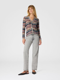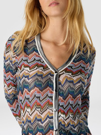 Slim-fit V-neck women’s cardigan, featuring refined raschel lacework that gives the garment a delicate and refined elegance. Made of viscose blend, this cardigan combines comfort and style, perfect for gracefully completing any look. MORE DETAILS - V-neck buttoned cardigan - Raschel knit in embroidered lace - Viscose and wool blend with lame threads Composition: EXTERNAL:66%Rayon, 30%Wool, 4%Metal Fiber Care instructions: Dry cleaning in tetrachloroethene - mild process ; Wash max 30°C - Very mild process ; Do not tumble dry ; Dry flat ; Steam iron only ; Do not iron ; Do not bleach Made in: Italy Product ID DS25WM06BR012FSM9R3