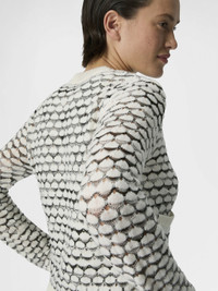 The mesh knit adds texture and character to this women’s crew-neck cardigan with buttons in cashmere and viscose, enriched with contrasting trims that enhance its lines and contemporary style. MORE DETAILS - Women's crewneck cardigan with buttons - Mesh knit - Contrasting trims - Cashmere and viscose Composition: EXTERNAL:80%Cashmere goat, 20%Rayon Care instructions: Ironing maximum temperature 110°C - without steam ; Hand wash ; Dry cleaning in tetrachloroethene ; Dry flat ; Do not tumble dry ; Do not bleach Made in: Italy Product ID DS26SM0BBK01HCS01KQ