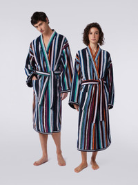 A light that catches the eye like sunlight filtered through the colours of Gothic stained glass windows is the effect created by incorporating metallic lurex threads into the vivid polychrome texture of Chandler, a hoodless bathrobe. MissoniHome skilfully harmonises the careful arrangement of the series of stripes with the vibrant movement of the luminous reflections, creating a combination of style and brilliance. MORE DETAILS - Cotton and viscose terry bathrobe - Multicoloured striped pattern with lurex - Contrasting edges - Waist belt - Patch pockets Composition: EXTERNAL:77%Cotton, 17%Rayon, 6%Metal Fiber Care instructions: Ironing maximum temperature 150°C; Do not dry clean; Tumble drying at lower temperature; Wash max 40°C; Do not bleach Made in: Portugal Product ID 1C3AC99760150