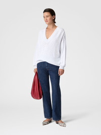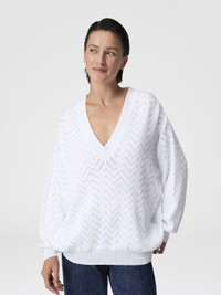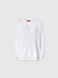 An oversized women’s V-neck pullover crafted from a cotton and viscose blend. The solid-color chevron motif runs elegantly across the knit, while the generous fit and long sleeves ensure comfort and fluidity. A piece that combines modernity and sophistication in Missoni’s distinctive style. MORE DETAILS - Women's V-neck pullover - Oversized fit and long sleeves - Tone-on-tone chevron pattern - Viscose and cotton blend Composition: EXTERNAL:63%Cotton, 37%Rayon Care instructions: Hand wash ; Ironing maximum temperature 110°C - without steam ; Dry cleaning in tetrachloroethene ; Dry flat ; Do not tumble dry ; Do not bleach Made in: Italy Product ID DC26SN01BK01H2S01KO