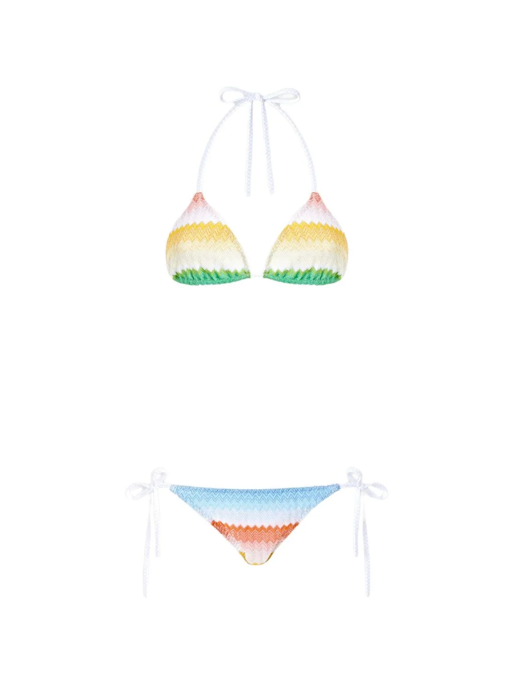 chevron-patterned bikini Highlights - White and multicoloured - Chevron pattern - String detail - Two-piece set - Triangle cup - Tie fastening - Be mindful to try on swimwear over your own garments. - The item you receive may differ slightly from the item photographed. this is due to the artisanal nature with which all missoni products are constructed. Made in Italy Composition Outer: Viscose 87%, Metallic Fibre 7%, Polyamide 6% Lining: Polyamide 80%, Elastane 20% Washing instructions Hand Wash