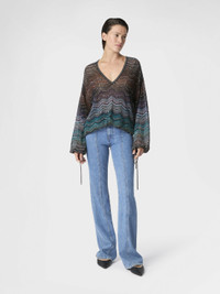 A sophisticated and lightweight reinterpretation of the maison’s iconic graphics, expressing the unmistakable balance between luminosity, movement, and Missoni style. This oversized women’s blouse in viscose chevron lame with sequins features a deep V-neckline that enhances femininity with natural elegance. MORE DETAILS - Women's oversized blouse with long sleeves - Deep V-neckline - Chevron pattern - Viscose lame blend - Applied sequins Composition: EXTERNAL:78%Rayon, 11%Metal Fiber, 11%Polyamide Care instructions: Hand wash ; Ironing maximum temperature 110°C - without steam ; Dry cleaning in tetrachloroethene ; Do not tumble dry ; Dry flat ; Do not bleach Made in: Italy Product ID DS26SJ0FBK01H9SM9ZT