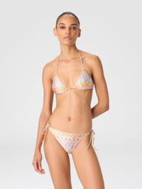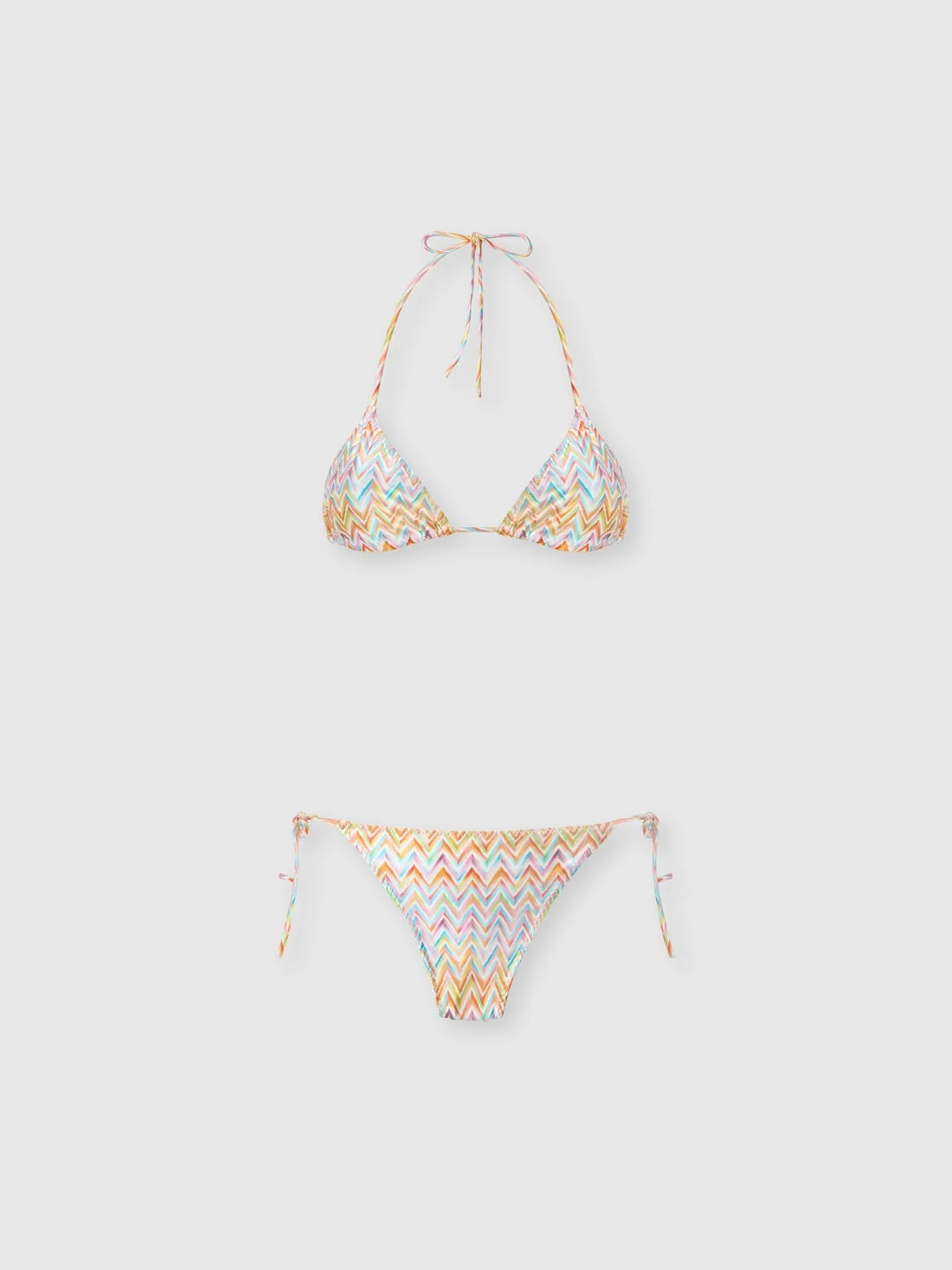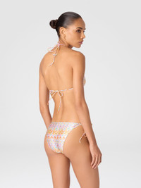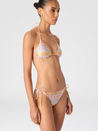 Triangle bikini in printed technical fabric elevated by the maison’s iconic zigzag motif with adjustable ties on the bottom and behind the neck ensuring a customizable fit while the vibrant print adds personality and flair to the summer silhouette. It is a timeless classic from Missoni’s beachwear line. MORE DETAILS - Triangle bikini in printed technical fabric - Adjustable design - Iconic zig zag pattern Composition: EXTERNAL:78%Polyamide, 22%Elastane; LINING : 80%Polyamide, 20%Elastane Care instructions: Hand wash ; Do not tumble dry ; Do not dry clean ; Do not iron ; Do not bleach Made in: Italy Product ID MC22SP00BJ00ODSM9R0