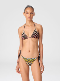 Classic bikini crafted in raschel knit with adjustable ties behind the neck and on the bottoms for a custom fit. The viscose and lame blend fabric is decorated with Missoni’s iconic zigzag motif adding a stylish luminous touch to your beach look. MORE DETAILS - Triangle bikini - Chevron pattern - Viscose and lame blend Composition: EXTERNAL:60%Rayon, 25%Polyester, 15%Metal Fiber; LINING : 80%Polyamide, 20%Elastane Care instructions: Hand wash ; Do not tumble dry ; Do not dry clean ; Do not iron ; Do not bleach Made in: Italy Product ID MC22SP00BR012RSM9QH