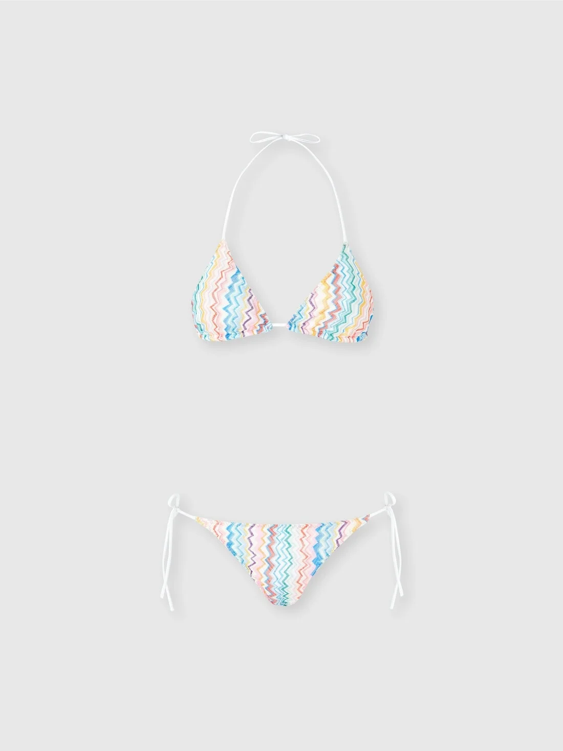 A refined classic bikini in printed Raschel fabric, with adjustable tie details on the briefs and top for a personalized fit. Missoni’s famous zigzag pattern enhances the charm of the design, making it ideal for a chic and lively summer look. MORE DETAILS - Women's classic bikini - Iconic zig zag pattern - Customizable fit - Raschel printed workmanship Composition: EXTERNAL:100%Polyester; LINING : 80%Polyamide, 20%Elastane Care instructions: Hand wash ; Do not tumble dry ; Do not dry clean ; Do not iron ; Do not bleach Made in: Italy Product ID MC22SP00BR0130SM9QJ