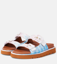 Product Details - Upper: fabric - Lining: leather - Sole: rubber insole and sole - Toe shape: almond open toe - Made in Italy - Includes: shoe box, dust bag - Designer color name: Blue Ocean - Item color: blue - Closure: faux-buckle fastening - Hardware color: gold - Item number: P01043249 Size & Fit - Fits slightly large to size - we recommend trying a half size smaller - European sizes - 3cm-1" platform (size EU 38)
