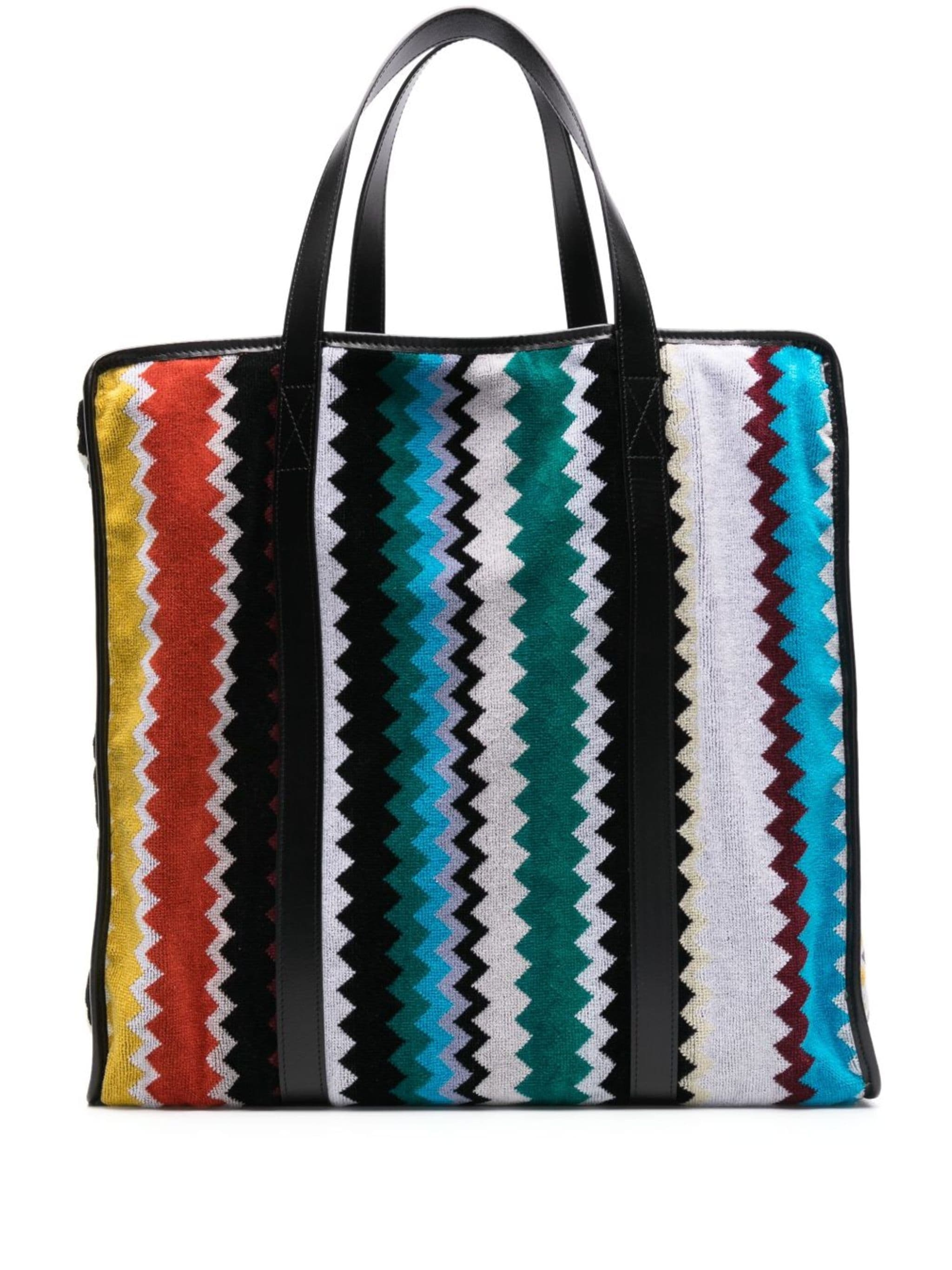 black/multicolour cotton towelling finish signature zigzag woven design leather trim open top two flat top handles main compartment two internal slip pockets internal logo patch full lining The item you receive may differ slightly from the item photographed. This is due to the artisanal nature with which all Missoni products are constructed. Size & Fit Model Measurements: Bust: 0cm Height: 0cm Hips: 0cm Waist: 0cm DEPTH: 16cm HANDLE: 17cm HEIGHT: 42cm WIDTH: 42cm Fabric and Care Designer Style ID: 1C3OG00034 Designer Colour: 100 - MULTICOLOR Composition: Outer: Cotton 100%Made in Italy