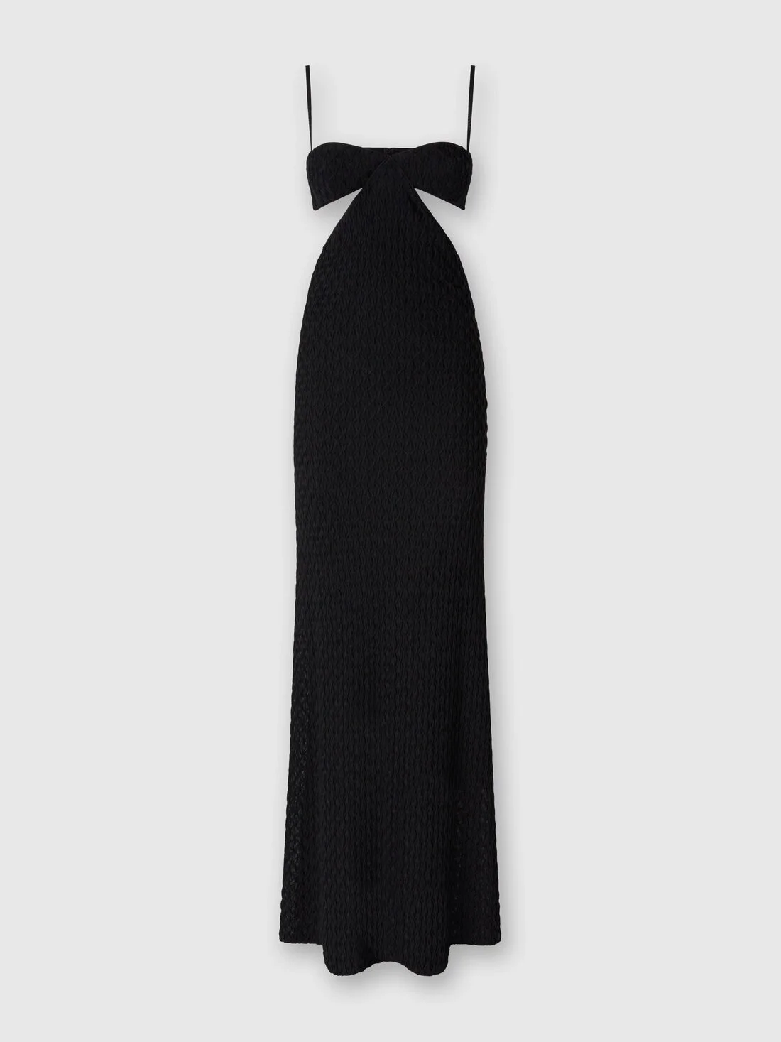 This bold and sophisticated women’s long dress is perfect for elegant evenings. Sleeveless with intriguing cut-outs, it features a relief lace raschel knit in wool blend. Its streamlined structure and refined details highlight femininity with elegance. MORE DETAILS - Cut-out long dress - Raschel knit - Relief lace motif - Wool blend Composition: EXTERNAL:54%Wool, 46%Rayon; LINING : 82%Polyester, 18%Elastane Care instructions: Ironing maximum temperature 110°C - without steam ; Dry cleaning in tetrachloroethene - mild process ; Dry flat ; Do not tumble dry ; Do not wash ; Do not bleach Made in: Italy Product ID DS25WG0QBR012J93911