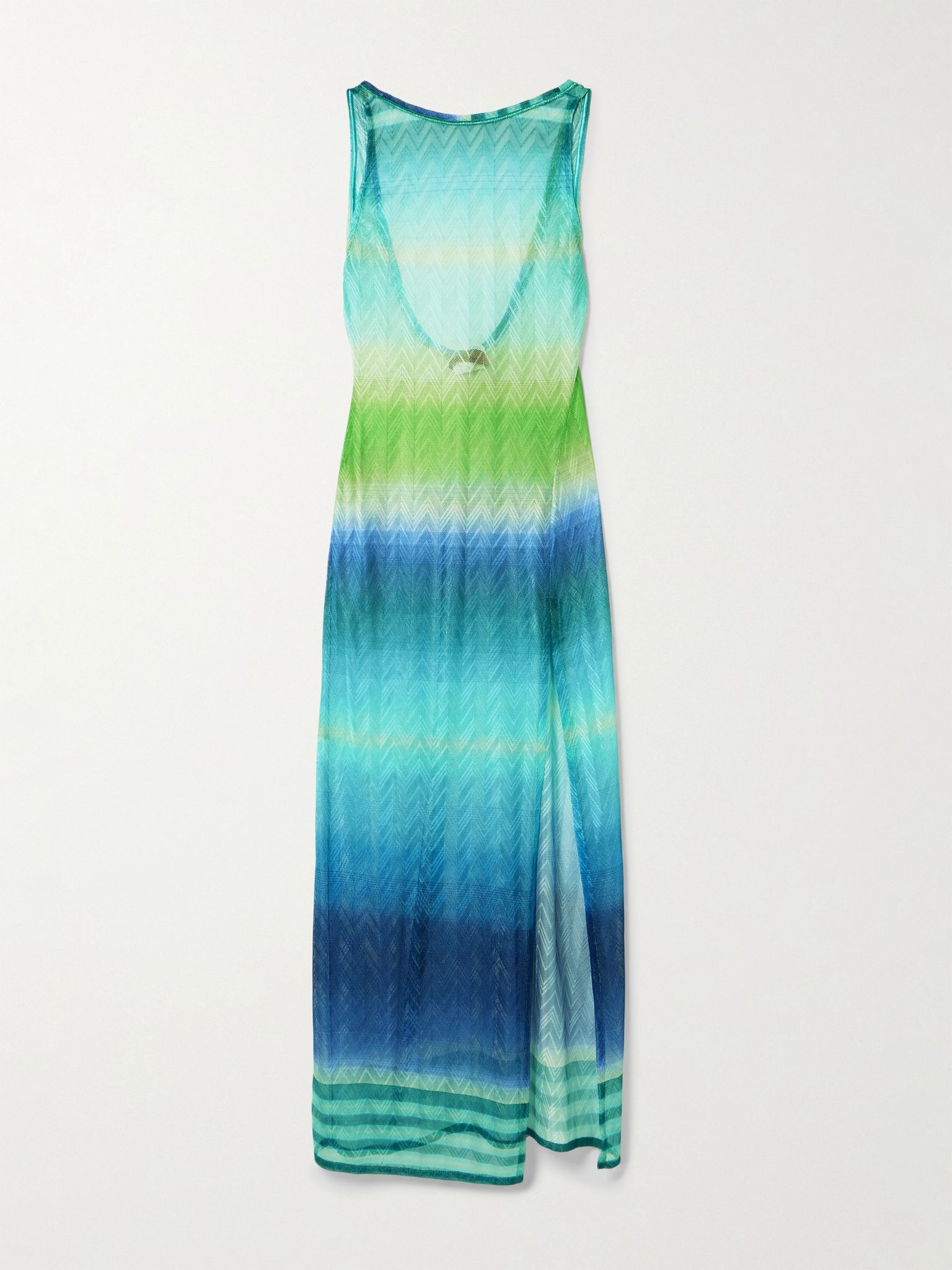 Missoni's dress is made using the label's signature crochet-knit technique, which features the equally iconic chevron stripes throughout. It's printed in shades of blue and green, creating a pretty degrade-, and has a low scooped back and generous side split. Size & Fit - Fits true to size, take your normal size - Designed for a slim fit - Mid-weight, stretchy fabric - Model is 180cm/ 5'11" and is wearing an IT 40 Model measurements: - Bust: 80cm/ 31.5" - Waist: 65cm/ 25.5" - Hip: 89cm/ 35" Details & Care - Multicolored crochet-knit - Slips on - 100% polyester - Unlined - Dry clean