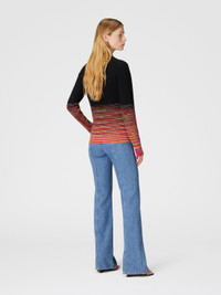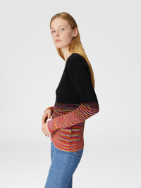 The degrade slub cashmere V-neck sweater is a true tribute to Missoni's heritage. The play of shades and the slub texture give the garment a unique visual dimension, while the V-neck and long sleeves balance its elegant and timeless silhouette. A high-quality garment that reflects the attention to detail typical of the maison. MORE DETAILS - Crop cut T-shirt - Crew neck model - Degrade slub cashmere - 3/4 sleeves Composition: EXTERNAL:100%Cashmere goat Care instructions: Ironing maximum temperature 110°C - without steam ; Hand wash ; Dry cleaning in tetrachloroethene ; COOL HAND WASH ; Iron inside out ; Do not tumble dry ; Dry flat ; Use neutral detergent ; Do not bleach Made in: Italy Product ID DS25SN03BK045CS91NJ