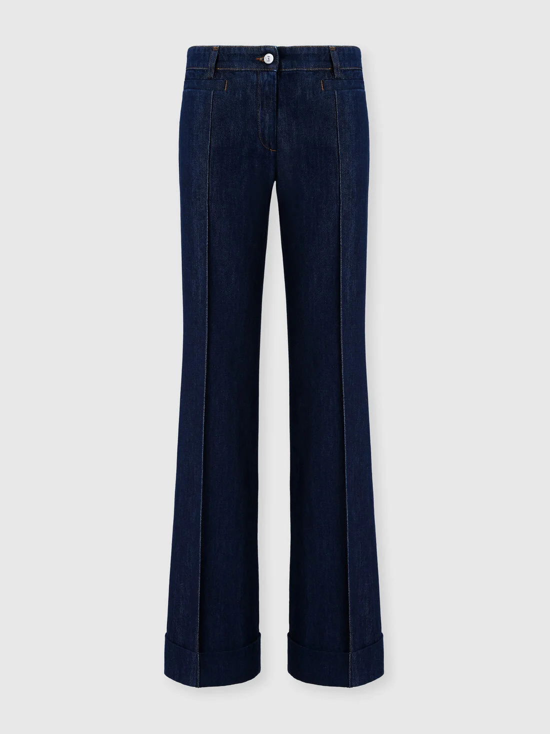 Denim Flared Trousers with Cuffed Hem and Center Crease