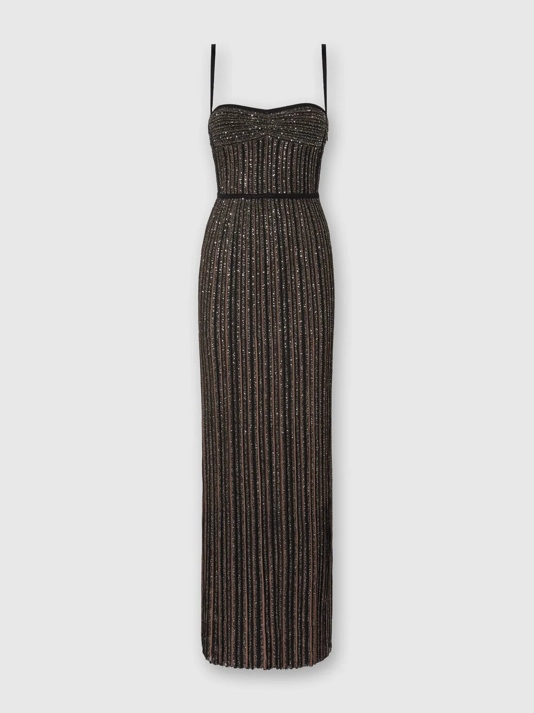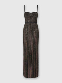 With an elegant and sophisticated spirit, this long sleeveless women’s dress is made of striped knit with lame threads in a viscose blend. The combination of luminous details and the fluid silhouette creates a perfect balance between modernity and refinement, making it ideal for occasions that require style and lightness. MORE DETAILS - Sleeveless long dress - Striped knit - Viscose blend with lame yarns Composition: EXTERNAL:75%Rayon, 16%Polyamide, 8%Metal Fiber, 1%Elastane; LINING : 88%Polyester, 12%Elastane Care instructions: Dry cleaning in tetrachloroethene - mild process ; Ironing maximum temperature 110°C - without steam ; Wash in net bag ; Dry inside out ; Dry flat ; Do not tumble dry ; Iron inside out ; Do not wash ; Do not bleach Made in: Italy Product ID DS25WG10BK01CLS80E3