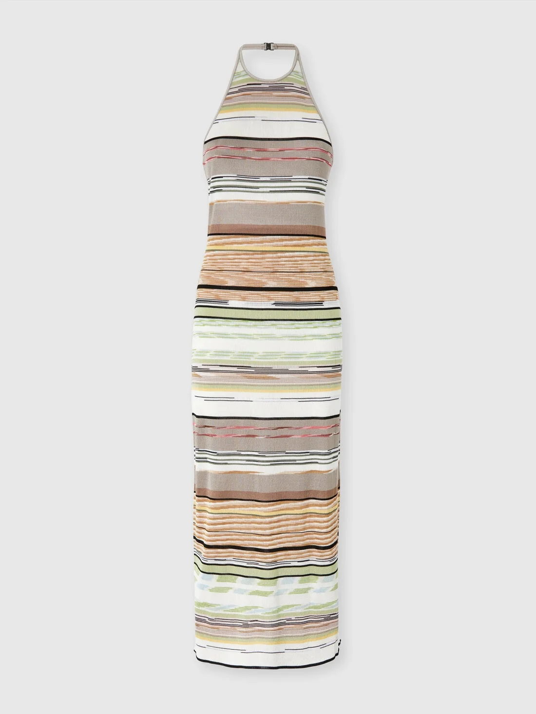 A long sleeveless women’s dress that celebrates femininity with a halter neckline and open back. The flame-effect striped motif gives movement and lightness to this piece in pure viscose, enhancing the silhouette with natural and refined elegance. MORE DETAILS - Women's long dress with halter neckline - Open back - Flame-effect striped knit - 100% viscose Composition: EXTERNAL:100%Rayon Care instructions: Dry cleaning in tetrachloroethene ; Dry flat ; Do not tumble dry ; Ironing maximum temperature 150°C ; Wash max 70°C ; Do not bleach Made in: Italy Product ID DS26SG18BK01H0SMSMN