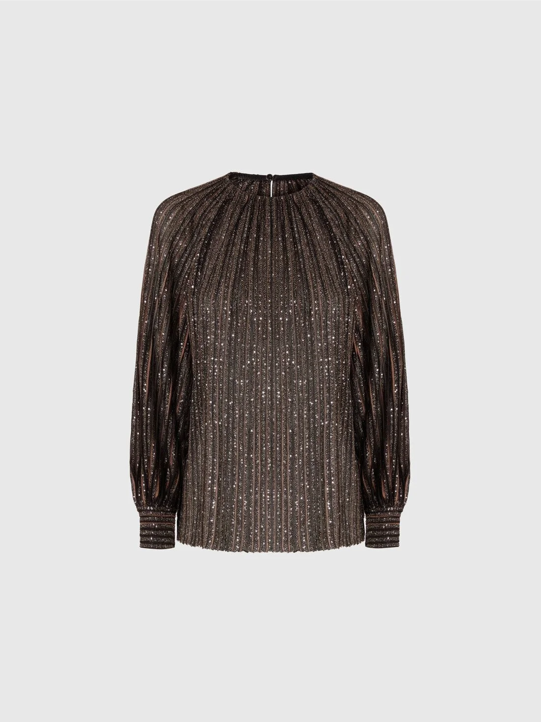 With an elegant and sophisticated spirit, this flared long-sleeve crew-neck women’s sweater, made of striped knit with lame threads, features a fluid silhouette that enhances its refinement. The combination of clean lines and luminous details creates a perfect balance between classicism and modernity, making it ideal for special occasions that require style and class. MORE DETAILS - Women's long-sleeve flared crew-neck top - Striped knit - Viscose blend with lame yarns Composition: EXTERNAL:70%Rayon, 23%Polyamide, 7%Metal Fiber Care instructions: Dry cleaning in tetrachloroethene - mild process ; Ironing maximum temperature 110°C - without steam ; Wash in net bag ; Iron inside out ; Dry inside out ; Dry flat ; Do not tumble dry ; Do not wash ; Do not bleach Made in: Italy Product ID DS25WN17BK01CLS80E3