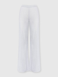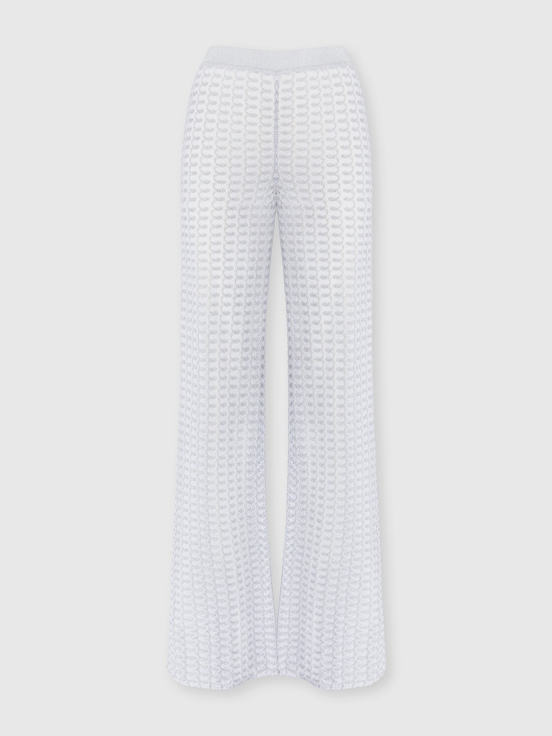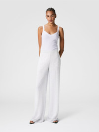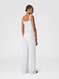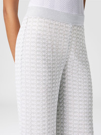 A sophisticated interpretation of the classic pantapalazzo, where the tonal lace pattern integrates with the sheen of lame to create an effect rich in texture and depth. The fluid silhouette glides lightly, while the workmanship of the fabric reflects the unmistakable craftsmanship of the Missoni maison. MORE DETAILS - Crew neck sweater - Viscose processing - Lame filaments - Lace pattern Composition: EXTERNAL:84%Rayon, 16%Metal Fiber; LINING : 77%Polyamide, 23%Elastane Care instructions: Dry cleaning in tetrachloroethene - mild process ; Do not tumble dry ; Steam iron only ; Dry flat ; Do not iron ; Do not wash ; Do not bleach Made in: Italy Product ID DS25SI0MBR010RS01FC