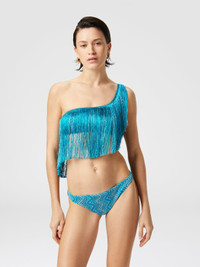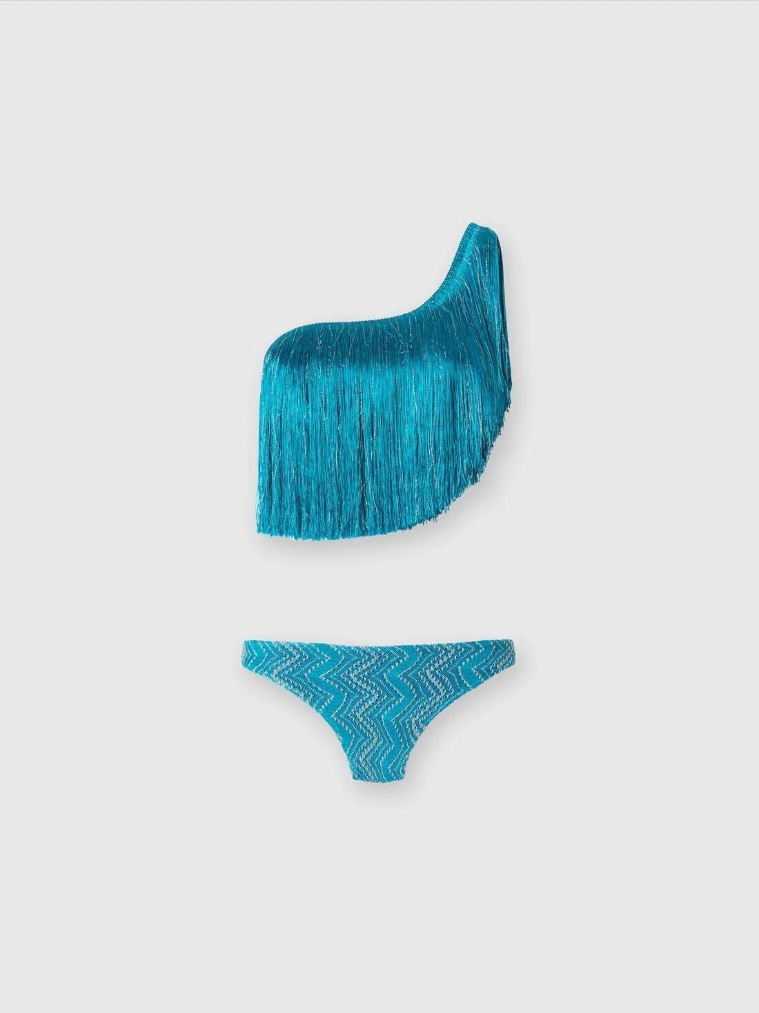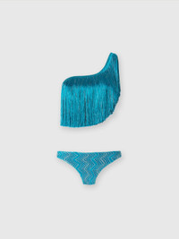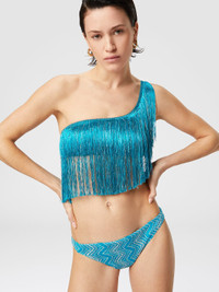 One-shoulder zigzag lamé viscose bikini with fringes