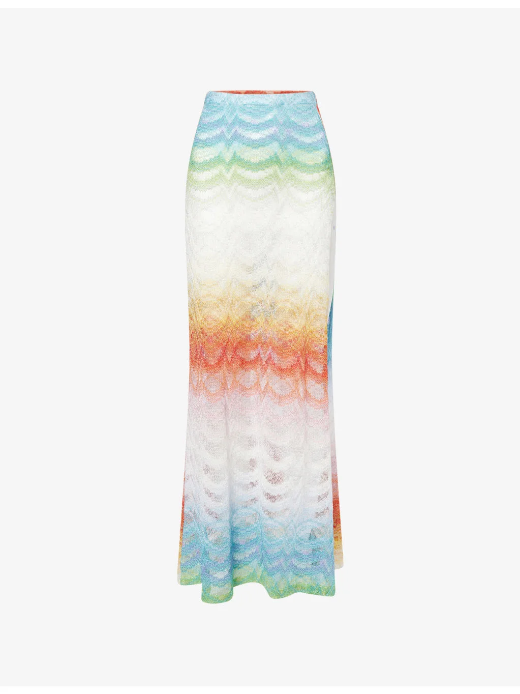 PRODUCT DETAILS - Missoni knitted maxi skirt - 88% rayon, 12% metallic fibres - Regular fit, mid-rise, elasticated waistband, gradient pattern, split hem, open knit - Hand wash - Made in Italy - True to size - Model is 5ft 10in/1.78m and wears a size small - Lightweight, stretchy Ref: R04602217