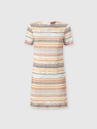 An interweaving of colors and textures comes to life in this mini-dress, where the Greek zigzag motif blends with lame to create a vibrant visual effect. Every detail is a celebration of traditional craftsmanship, interpreted with the modernity typical of Missoni. MORE DETAILS - Flair Pants - Viscose processing - Greek pattern - Lame filaments Composition: EXTERNAL:65%Rayon, 27%Cotton, 8%Metal Fiber; LINING : 100%Polyester Care instructions: Dry cleaning in tetrachloroethene - mild process ; Do not tumble dry ; Dry flat ; Steam iron only ; Do not iron ; Do not wash ; Do not bleach Made in: Italy Product ID DS25SG1HBR010QS6143