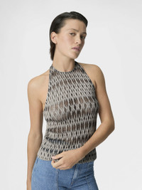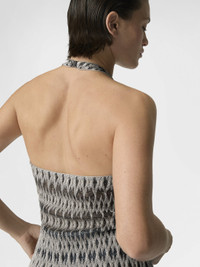 MORE DETAILS - Women's halter-neck top - Raschel knit - 3D diamond pattern - Viscose lame blend Composition: EXTERNAL:58%Rayon, 28%Metal Fiber, 14%Polyamide Care instructions: Hand wash ; Ironing maximum temperature 110°C - without steam ; Do not tumble dry ; Dry flat ; do not soak ; Do not dry clean ; Cool Hand Wash ; Do not bleach Made in: Italy Product ID DS26SK01BR014VS91RO