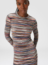 The long-sleeved crew-neck mini-dress is reinvented thanks to the 3D effect that ruffles the ribs of the wool and viscose sweater. The slub pattern guarantees the recognisability of this garment perfect for the daily look. MORE DETAILS - Crew-neck mini-dress - Long Sleeves - 3D Ribbed Knitting - Flamed pattern Composition: EXTERNAL:60%Rayon, 40%Wool Care instructions: Hand wash ; Dry cleaning in tetrachloroethene - mild process ; Ironing maximum temperature 110°C - without steam ; Do not tumble dry ; Dry flat ; Iron with a cloth between ; Do not bleach Made in: Tunisia Product ID DS24WG2BBK040BSM9FD
