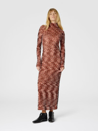 A synthesis of sophisticated elegance and textile savoir-faire, this long women’s dress with high neck and long sleeves is crafted from a refined raschel knit in flamed lace. The wool and viscose blend gives the fabric a warm yet lightweight texture, enhancing both the richness of the pattern and the flow of the silhouette. MORE DETAILS - Long dress with high neck - Long sleeves - Raschel knit with flame lace - Wool and viscose blend Composition: EXTERNAL:54%Wool, 46%Rayon Care instructions: Dry cleaning in tetrachloroethene - mild process ; Ironing maximum temperature 110°C - without steam ; Wash max 30°C - Very mild process ; Do not tumble dry ; Dry flat ; Do not dry clean ; Do not wash ; Line dry ; Do not bleach Made in: Italy Product ID DS25WG24BR012NF4031