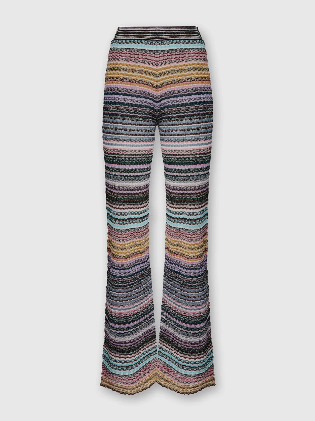A long, straight-leg women’s trouser that combines structure and brilliance, made with refined ribbed striped workmanship. The viscose blend yarn with lame threads enhances the three-dimensional texture with delicate reflections, creating a sophisticated piece with strong visual impact. MORE DETAILS - Straight-leg long pants - Popcorn stitch knit - Striped pattern - Viscose blend with lame threads Composition: EXTERNAL:82%Rayon, 12%Metal Fiber, 5%Polyamide, 1%Elastane Care instructions: Dry cleaning in tetrachloroethene - mild process ; Ironing maximum temperature 110°C - without steam ; Steam iron only ; Dry flat ; Do not tumble dry ; Iron inside out ; Do not wash ; Do not bleach Made in: Tunisia Product ID DS25WI0JBK01CELM04G