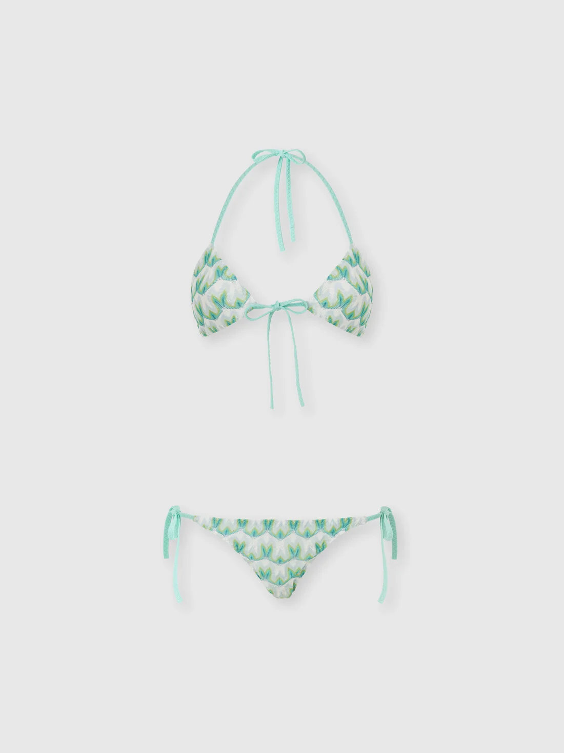 Missoni signs this women’s triangle bikini in viscose with floral lace detailing and adjustable ties for a personalized fit. MORE DETAILS - Women's bikini with front tie - Floral lace knit - 100% viscose Composition: EXTERNAL:100%Rayon; LINING : 80%Polyamide, 20%Elastane Care instructions: Hand wash ; Do not tumble dry ; Do not dry clean ; Do not iron ; Cool Hand Wash ; Do not bleach Made in: Italy Product ID MS26SP00BR014IS72OR