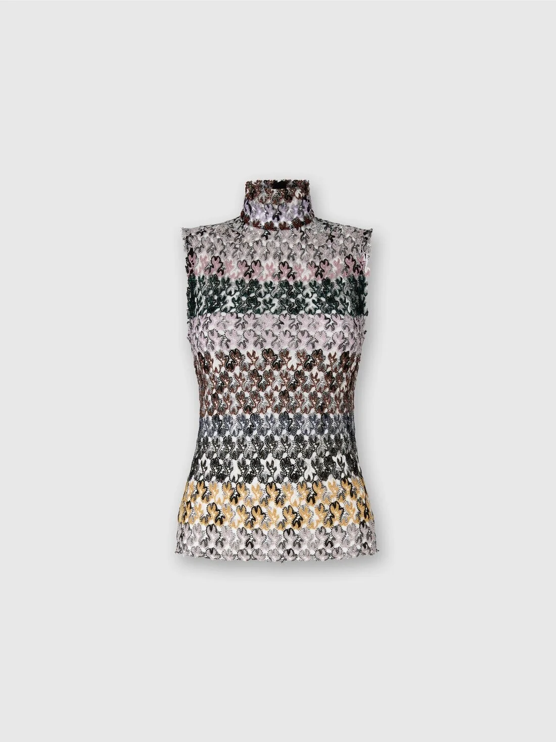 A touch of light and sophistication for this women’s high-neck top, defined by precious raschel lace with a striped pattern. The lame threads woven into the yarn enhance the texture with delicate reflections, creating an elegant garment full of personality. MORE DETAILS - Sleeveless high-neck top - Raschel knit in striped lace pattern - Viscose blend with lame threads Composition: EXTERNAL:92%Rayon, 8%Metal Fiber Care instructions: Dry cleaning in tetrachloroethene - mild process ; Ironing maximum temperature 110°C - without steam ; Do not tumble dry ; Dry flat ; Do not wash ; Do not bleach Made in: Italy Product ID DS25WK08BR012ISM9QX