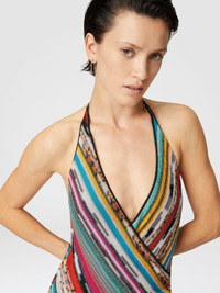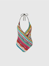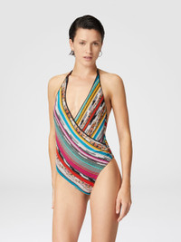 Opened by a plunging V-neckline, the women's one-piece swimsuit is presented in a wraparound silhouette. Made of slub viscose with striped raschel processing, it is enriched by the reflections of lame that give brightness to the fabric, enhancing the distinctive Missoni motif with elegance and refinement. MORE DETAILS - One-piece swimsuit - Flamed viscose and lame - V-neck Composition: EXTERNAL:88%Rayon, 12%Metal Fiber; LINING : 80%Polyamide, 20%Elastane Care instructions: Hand wash ; Do not tumble dry ; Do not dry clean ; Do not iron ; Do not bleach Made in: Italy Product ID MS25SP02BR00ZZS208H