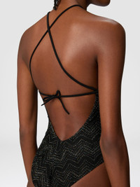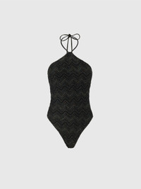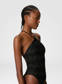 Zig zag lamé viscose one-piece swimsuit with halter neck