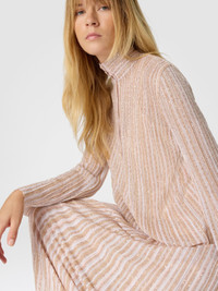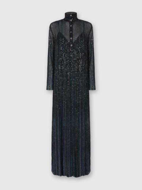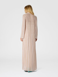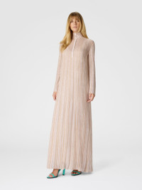 With an elegant and sophisticated spirit, this long-sleeve buttoned women's dress is made of striped knit with lame threads. It is enriched with sheer details that add a refined touch. The fluid silhouette and combination of luminous elements create a perfect balance between classicism and modernity, making it ideal for special occasions that require style and class. MORE DETAILS - Women's long button-up dress - Long sleeve - Striped knit - Viscose blend with lame yarns Composition: EXTERNAL:74%Rayon, 20%Polyamide, 6%Metal Fiber Care instructions: Dry cleaning in tetrachloroethene - mild process ; Ironing maximum temperature 110°C - without steam ; Wash in net bag ; Iron inside out ; Do not tumble dry ; Dry inside out ; Dry flat ; Do not wash ; Do not bleach Made in: Italy Product ID DS25WG11BK01CLS30FN