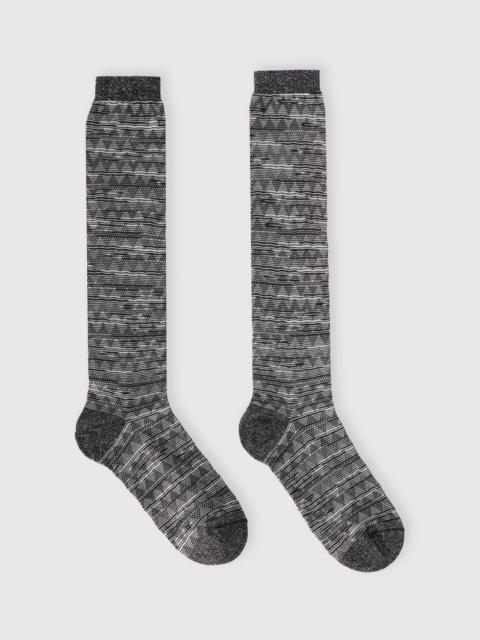 The melange trims enrich these women’s long socks. Made from a cotton-blend zigzag yarn, they’re the accessory that will add a special touch to your everyday look. MORE DETAILS - Women’s long socks - Cotton-blend zigzag - Contrasting inserts Composition: EXTERNAL:60%Cotton, 40%Polyamide Care instructions: Dry cleaning in tetrachloroethene ; Do not tumble dry ; Do not wash ; Do not iron ; Do not bleach Made in: Italy Product ID LS25WS0LBV00IHSM67V