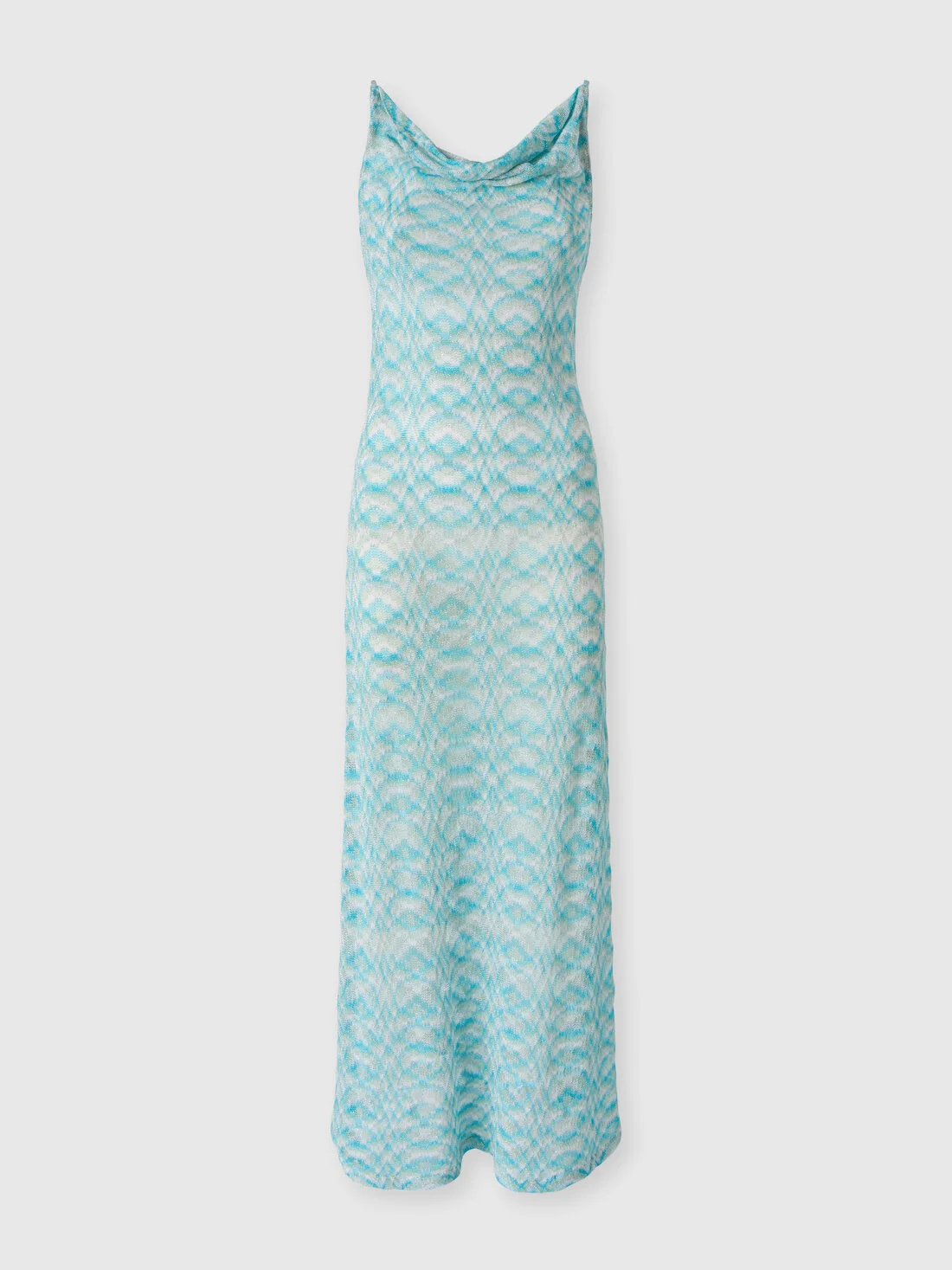 The shaded viscose lame envelops the silhouette of this women’s long beach cover-up dress, defined by an open back and side slits that enhance its movement. MORE DETAILS - Women's long beach cover-up dress - Open back and side slits - Raschel knit - Wave pattern - Viscose lame blend Composition: EXTERNAL:88%Rayon, 12%Metal Fiber Care instructions: Ironing maximum temperature 110°C - without steam ; Dry cleaning in tetrachloroethene ; Do not tumble dry ; Do not wash ; Do not bleach Made in: Italy Product ID MC26SQ02BR014HS72PQ