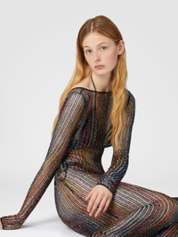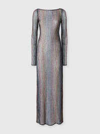 A piece that plays with transparency: the long cover-up in mesh wraps the body with a seductive see-through effect. The open back, long sleeves, and sequins add a sophisticated and glamorous touch. MORE DETAILS - Women's long-sleeve cover-up - Mesh design with lame - Open back - Embellished with sequins Composition: EXTERNAL:61%Rayon, 23%Metal Fiber, 16%Polyamide Care instructions: Ironing maximum temperature 110°C - without steam ; Dry cleaning in tetrachloroethene ; Do not tumble dry ; Do not wash ; Do not bleach Made in: Italy Product ID MS25SQ14BV00HDS91PF