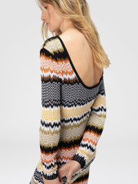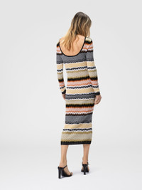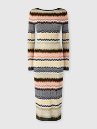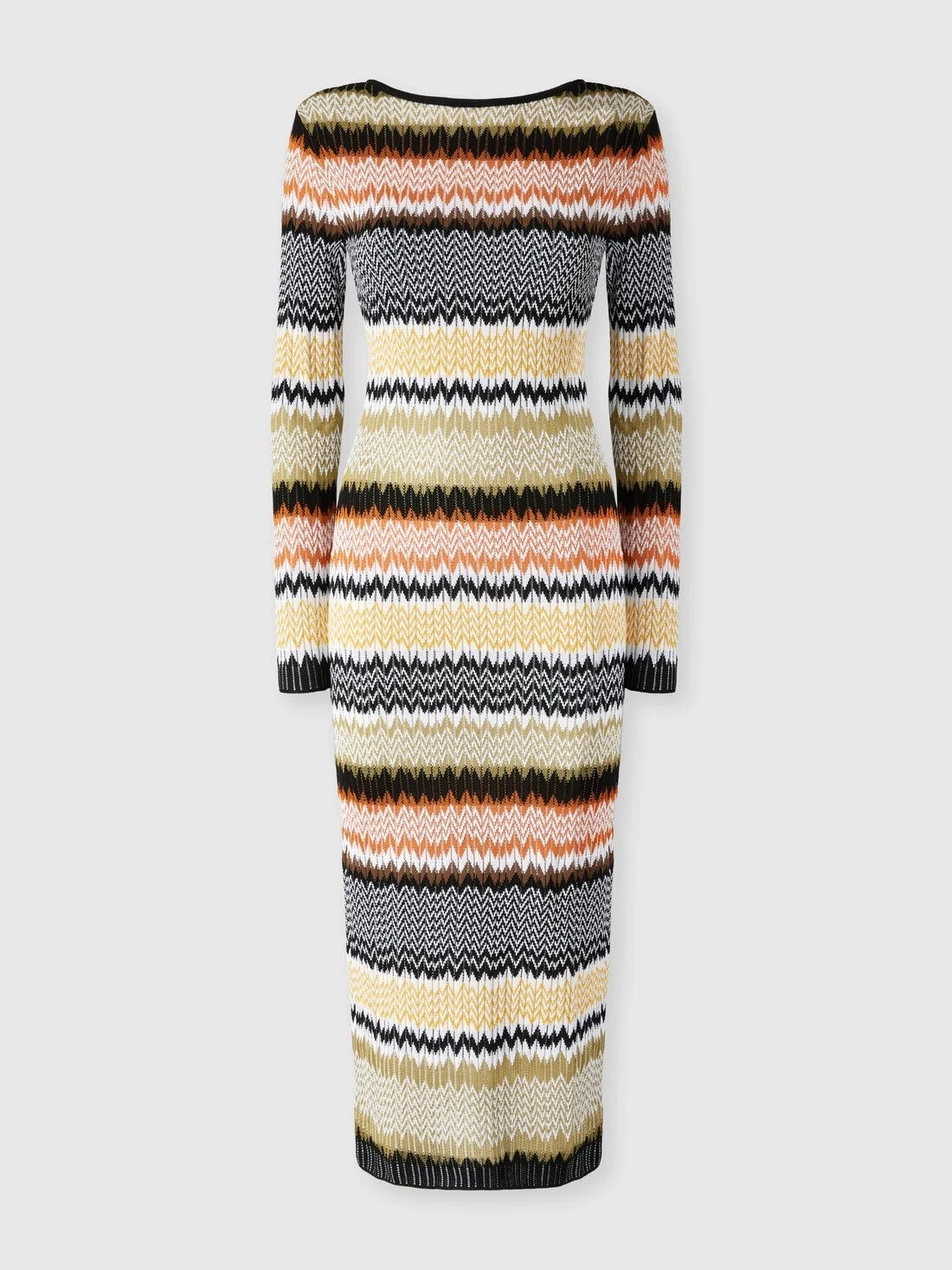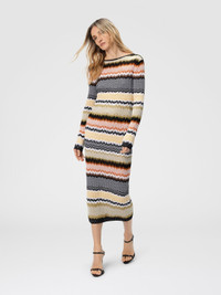 This elegant long-sleeved women’s crewneck dress by Missoni stands out with its refined back neckline, adding a subtle sensual touch. The jacquard knit, featuring a modern twist on the classic chevron motif, is enhanced by contrasting trims that emphasize its structure and dynamism. Ideal for those seeking a sophisticated yet contemporary look. MORE DETAILS - Crewneck long dress - Back neckline - Contrast trim - Jacquard knit - Chevron motif - Viscose and cotton blend Composition: EXTERNAL:50%Rayon, 48%Cotton, 1%Elastane, 1%Polyamide Care instructions: Ironing maximum temperature 110°C - without steam ; Dry cleaning in tetrachloroethene - mild process ; Wash inside out ; Dry flat ; Do not tumble dry ; Iron inside out ; Do not wash ; Do not bleach Made in: Italy Product ID DS25WG18BK01COSM9SN