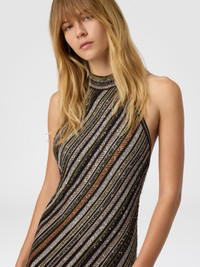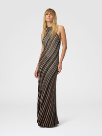 A luminous elegance defines this long women's dress by Missoni, featuring a halter neckline that enhances the figure. The herringbone striped knit is enriched with lame threads and sequins, creating a refined play of reflections—perfect for special occasions and true to the brand’s signature aesthetic. MORE DETAILS - Sleeveless long dress - Halter neckline - Herringbone stripe knit - Lurex threads and sequins Composition: EXTERNAL:68%Rayon, 27%Polyamide, 4%Metal Fiber, 1%Elastane; LINING : 88%Polyester, 12%Elastane Care instructions: Dry cleaning in tetrachloroethene - mild process ; Ironing maximum temperature 110°C - without steam ; Wash in net bag ; Iron inside out ; Dry inside out ; Do not tumble dry ; Dry flat ; Do not wash ; Do not bleach Made in: Italy Product ID DS25WG02BK01C3SM9T5