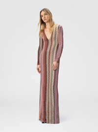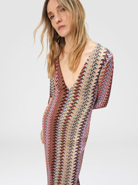 An ode to Missoni’s craftsmanship, this women’s long dress embodies the art of contemporary luxury. Featuring a deep V-neck and long sleeves, it’s made from precious raschel viscose-blend knit enriched with lame threads. The classic zigzag motif brings rhythm and motion to this elegant and magnetic piece. MORE DETAILS - Long dress - Long sleeves - V-neckline - Raschel knit - Zig zag motif - Lurex threads - Viscose blend Composition: EXTERNAL:89%Rayon, 6%Metal Fiber, 5%Polyamide; INTERNAL REINFORCEMENT:100%Polyamide; LINING : 82%Polyester, 18%Elastane Care instructions: Ironing maximum temperature 110°C - without steam ; Dry cleaning in tetrachloroethene - mild process ; Dry flat ; Do not tumble dry ; Do not wash ; Do not bleach Made in: Italy Product ID DS25WG0LBR012LSM9QY