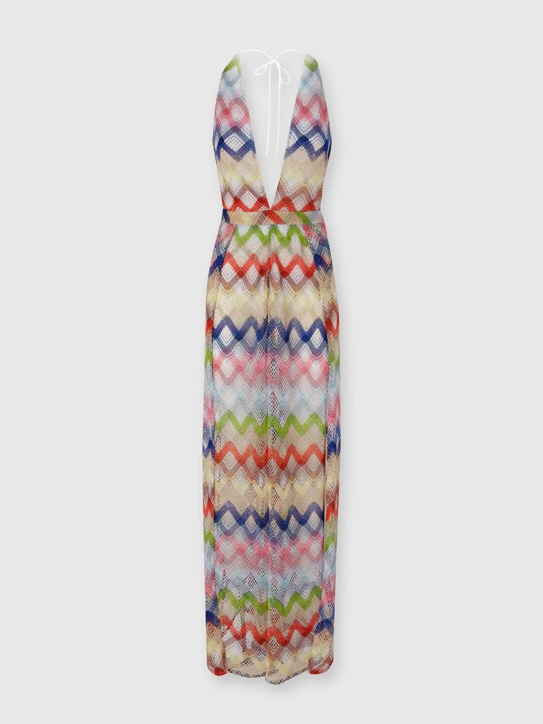 A fluid and lightweight jumpsuit with palazzo pants, featuring side slits and an open back design. Made from Raschel and viscose-lame mesh, its versatile cut is perfect for elegant events or casual moments with a stylish touch. MORE DETAILS - Women's long jumpsuit - V-neck - Raschel and mesh design - Viscose and lame workmanship - Palazzo pants with side slits Composition: EXTERNAL:73%Rayon, 14%Metal Fiber, 13%Polyamide Care instructions: Ironing maximum temperature 110°C - without steam ; Dry cleaning in tetrachloroethene ; Do not tumble dry ; Do not wash ; Do not bleach Made in: Italy Product ID MC25SG04BR012SSM9QN